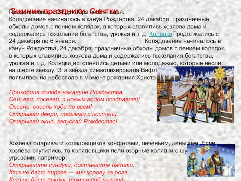 Колядование начиналось в канун Рождества, 24 декабря: праздничные обходы домов с пением колядок, в которых славились хозяева дома и содержались пожелания богатства, урожая и т. д. КолядкиПродолжались с 24 декабря по 6 января. Колядование начиналось в канун Рождества, 24 декабря: праздничные обходы домов с пением колядок, в которых славились хозяева дома и содержались пожелания богатства, урожая и т. д. Колядки исполнялись детьми или молодежью, которые несли на шесте звезду. Эта звезда символизировала Вифлеемскую звезду, которая появилась на небосводе в момент рождения Христа.