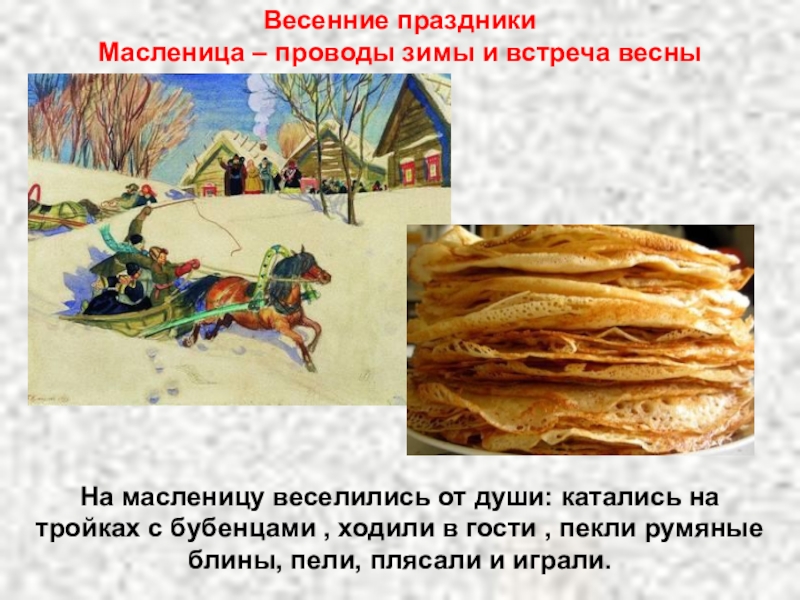Слайд 9На масленицу веселились от души: катались на тройках с бубенцами ,