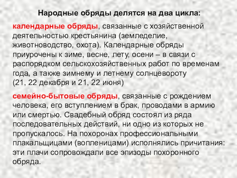 деятельностью крестьянина (земледелие, животноводство, охота). Календарные обряды приурочены к зиме, весне, лету, осени – в связи с распорядком сельскохозяйственных работ по временам года, а также зимнему и летнему солнцевороту (21, 22 декабря и 21, 22 июня)