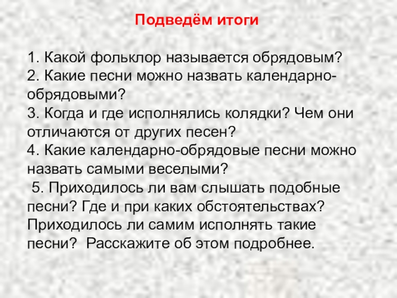 5. Приходилось ли вам слышать подобные песни? Где и при каких обстоятельствах? Приходилось ли самим исполнять такие песни? Расскажите об этом подробнее.