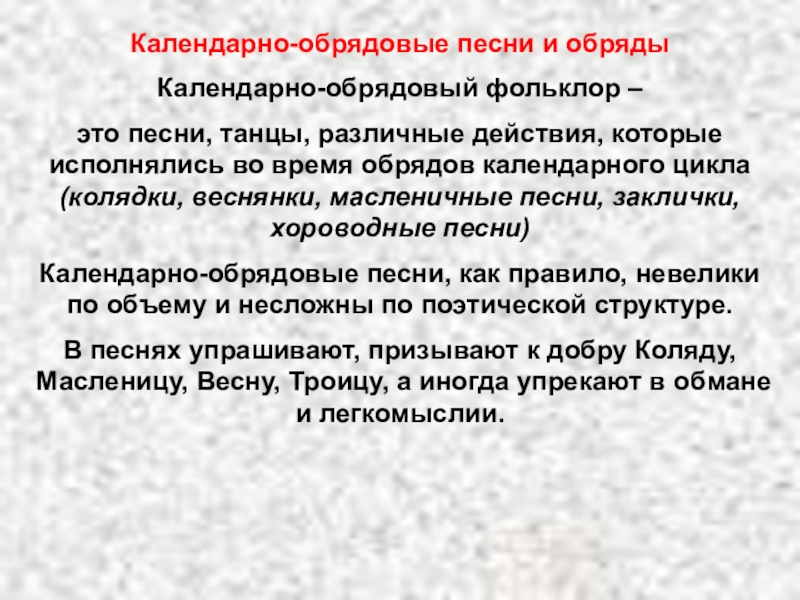 В песнях упрашивают, призывают к добру Коляду, Масленицу, Весну, Троицу, а иногда упрекают в обмане и легкомыслии.