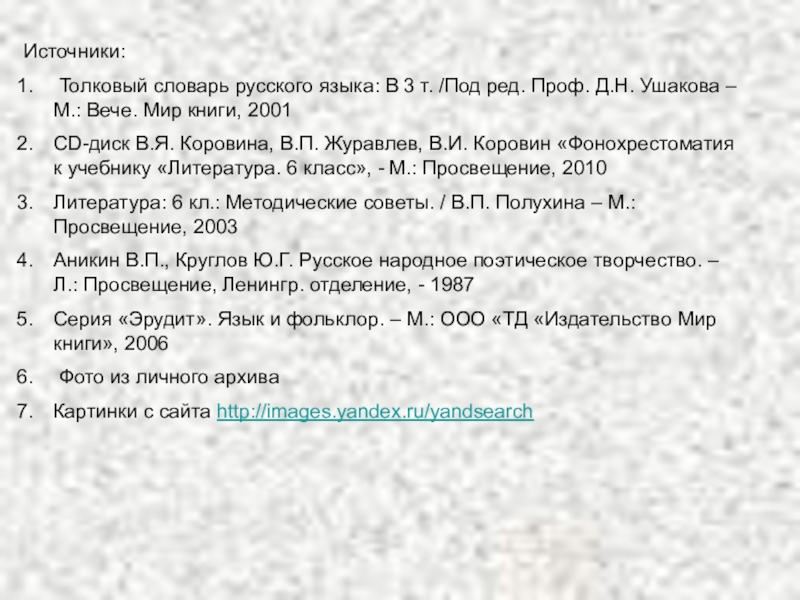 Аникин В.П., Круглов Ю.Г. Русское народное поэтическое творчество. – Л.: Просвещение, Ленингр. отделение, - 1987