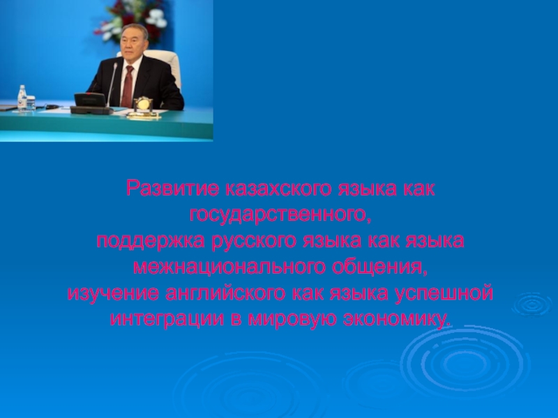 Развитие казахского языка как государственного, поддержка русского языка как языка межнационального общения, изучение английского как языка успешной интеграции в мировую экономику.