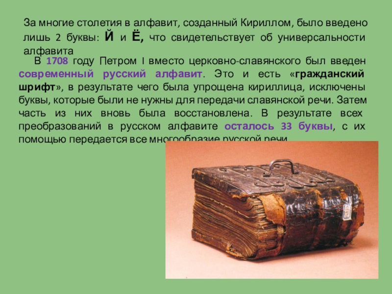 В 1708 году Петром I вместо церковно-славянского был введен современный русский алфавит. Это и есть «гражданский шрифт», в результате чего была упрощена кириллица, исключены буквы, которые были не нужны для передачи славянской речи. Затем часть из них вновь была восстановлена. В результате всех преобразований в русском алфавите осталось 33 буквы, с их помощью передается все многообразие русской речи.