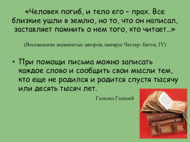 При помощи письма можно записать каждое слово и сообщить свои мысли тем, кто еще не родился и родится спустя тысячу или десять тысяч лет.