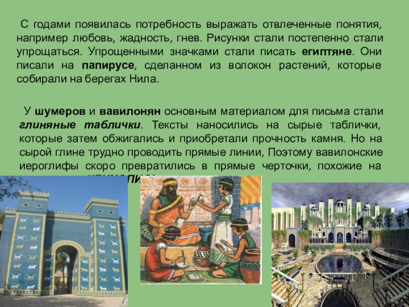 У шумеров и вавилонян основным материалом для письма стали глиняные таблички. Тексты наносились на сырые таблички, которые затем обжигались и приобретали прочность камня. Но на сырой глине трудно проводить прямые линии, Поэтому вавилонские иероглифы скоро превратились в прямые черточки, похожие на клинышки ? КЛИНОПИСЬ.