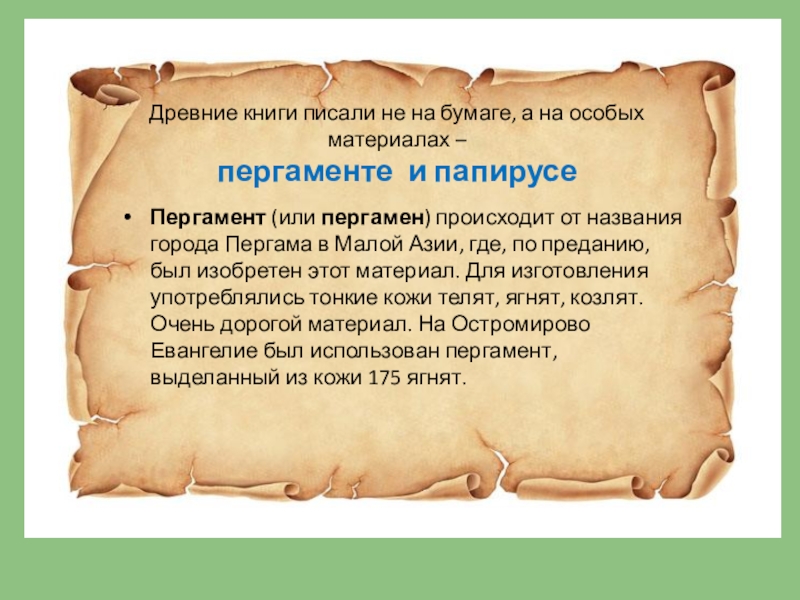 Пергамент (или пергамен) происходит от названия города Пергама в Малой Азии, где, по преданию, был изобретен этот материал. Для изготовления употреблялись тонкие кожи телят, ягнят, козлят. Очень дорогой материал. На Остромирово Евангелие был использован пергамент, выделанный из кожи 175 ягнят.