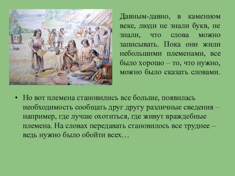Но вот племена становились все больше, появилась необходимость сообщать друг другу различные сведения – например, где лучше охотиться, где живут враждебные племена. На словах передавать становилось все труднее – ведь нужно было обойти всех…