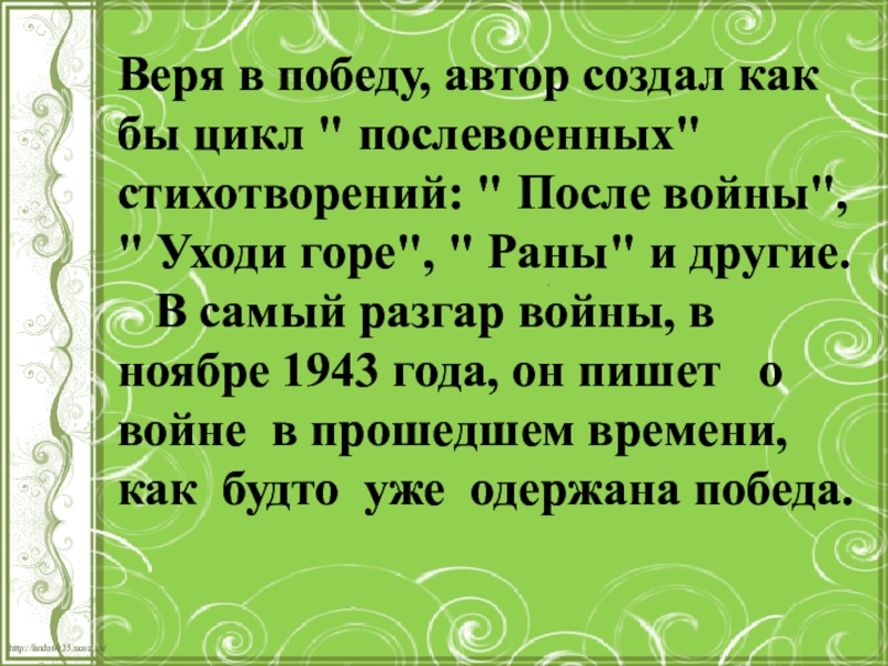 Слайд 17Веря в победу, автор создал как бы цикл " послевоенных" стихотворений: