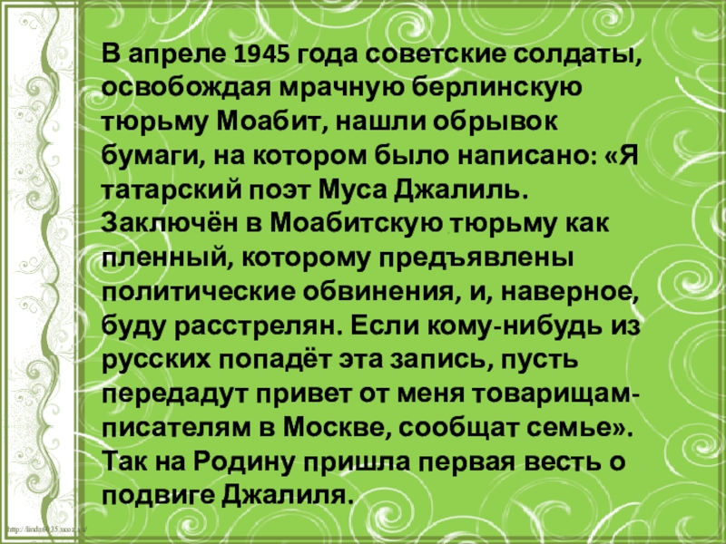 нашли обрывок бумаги, на котором было написано: «Я татарский поэт Муса Джалиль. Заключён в Моабитскую тюрьму как пленный, которому предъявлены политические обвинения, и, наверное, буду расстрелян. Если кому-нибудь из русских попадёт эта запись, пусть передадут привет от меня товарищам-писателям в Москве, сообщат семье». Так на Родину пришла первая весть о подвиге Джалиля.