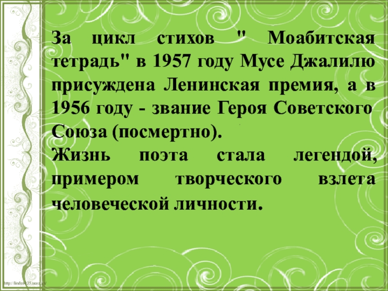 Слайд 23За цикл стихов " Моабитская тетрадь" в 1957 году Мусе Джалилю