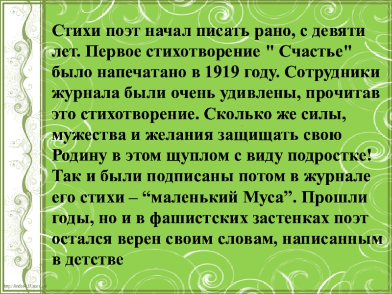 Счастье" было напечатано в 1919 году. Сотрудники журнала были очень удивлены, прочитав это стихотворение. Сколько же силы, мужества и желания защищать свою Родину в этом щуплом с виду подростке! Так и были подписаны потом в журнале его стихи – “маленький Муса”. Прошли годы, но и в фашистских застенках поэт остался верен своим словам, написанным в детстве