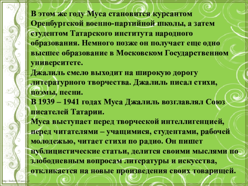 В 1939 – 1941 годах Муса Джалиль возглавлял Союз писателей Татарии.