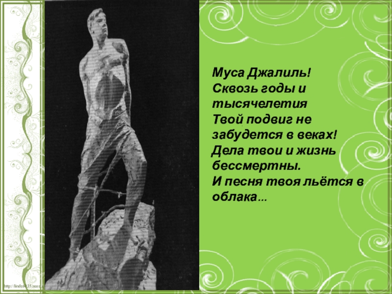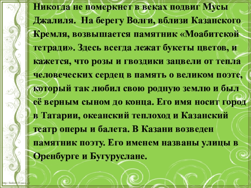 Слайд 26Никогда не померкнет в веках подвиг Мусы Джалиля. На берегу Волги,