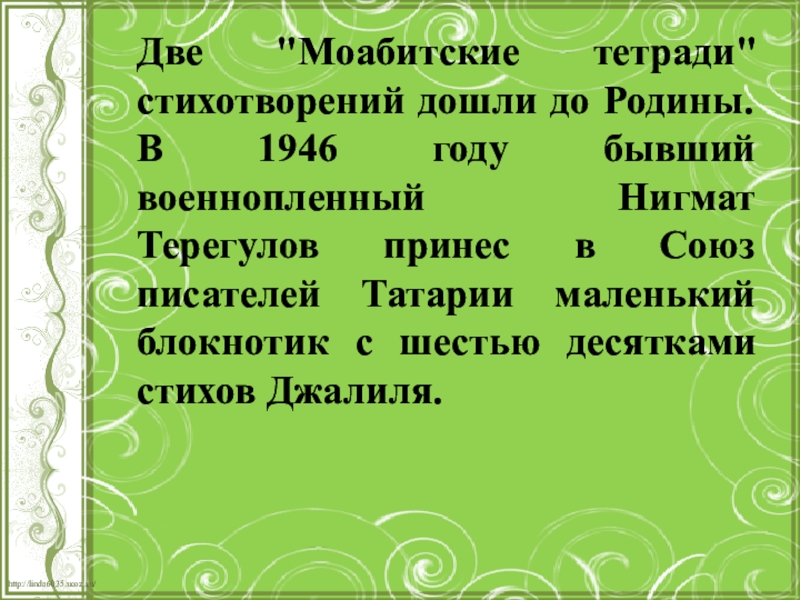 Слайд 18Две "Моабитские тетради" стихотворений дошли до Родины. В 1946 году бывший
