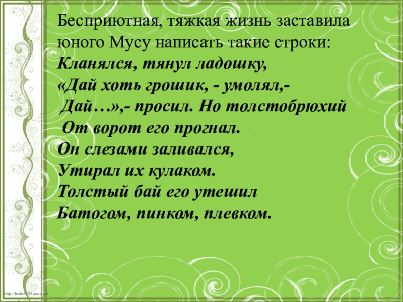 Слайд 8Бесприютная, тяжкая жизнь заставила юного Мусу написать такие строки: Кланялся, тянул