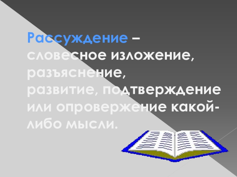 Слайд 4Рассуждение – словесное изложение, разъяснение, развитие, подтверждение или опровержение какой-либо мысли.