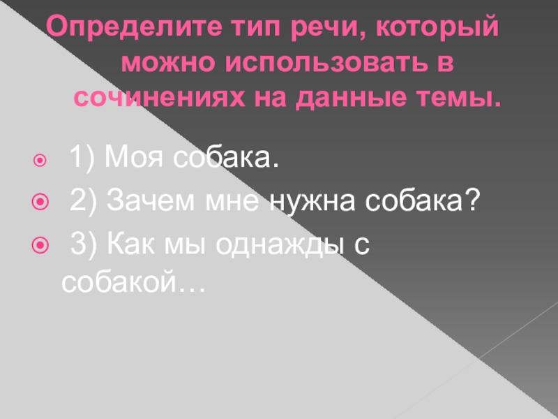 Определите тип речи, который можно использовать в сочинениях на данные темы.  1) Моя собака. 2) Зачем