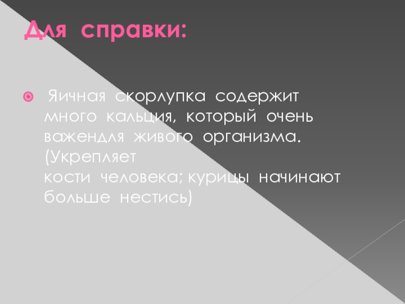 Для  справки:  Яичная  скорлупка  содержит   много  кальция,  который  очень  важендля  живого  организма. (Укрепляет   кости  человека;