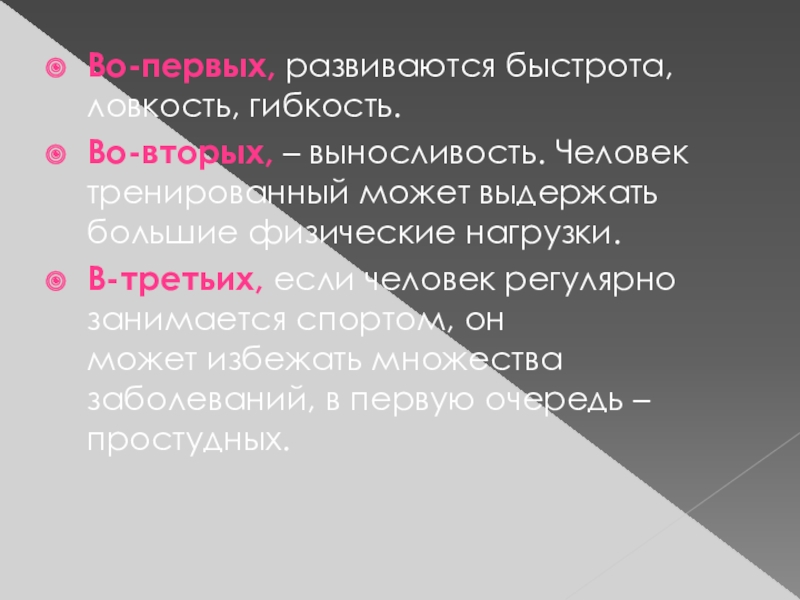 В-третьих, если человек регулярно занимается спортом, он может избежать множества заболеваний, в первую очередь – простудных.