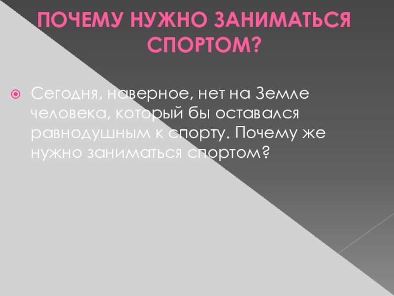 ПОЧЕМУ НУЖНО ЗАНИМАТЬСЯ  СПОРТОМ? Сегодня, наверное, нет на Земле человека, который бы оставался равнодушным к спорту.
