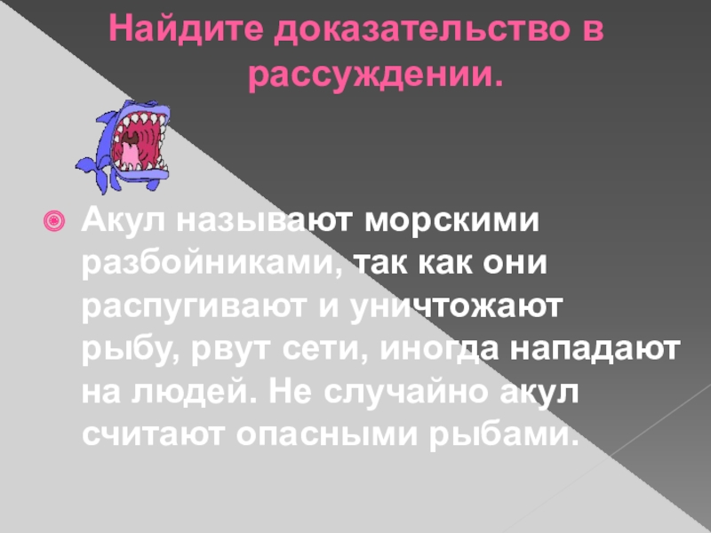 Найдите доказательство в рассуждении.  Акул называют морскими разбойниками, так как они распугивают и уничтожают  рыбу,