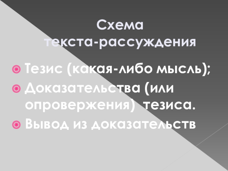 Схема текста-рассужденияТезис (какая-либо мысль);Доказательства (или опровержения) тезиса.Вывод из доказательств