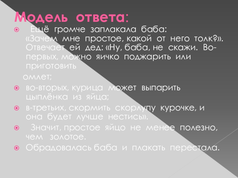 Модель  ответа:   Ещё  громче  заплакала  баба:  «Зачем  мне  простое, какой  от  него  толк?». Отвечает  ей