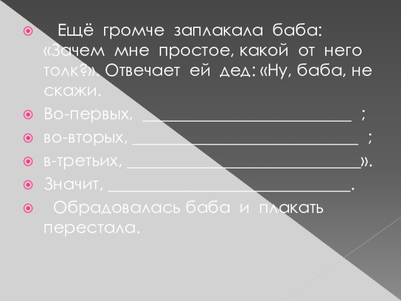 Ещё  громче  заплакала  баба: «Зачем  мне  простое, какой  от  него  толк?». Отвечает  ей  дед: «Ну,