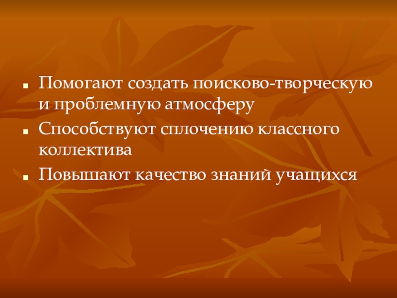 Слайд 26Помогают создать поисково-творческую и проблемную атмосферу