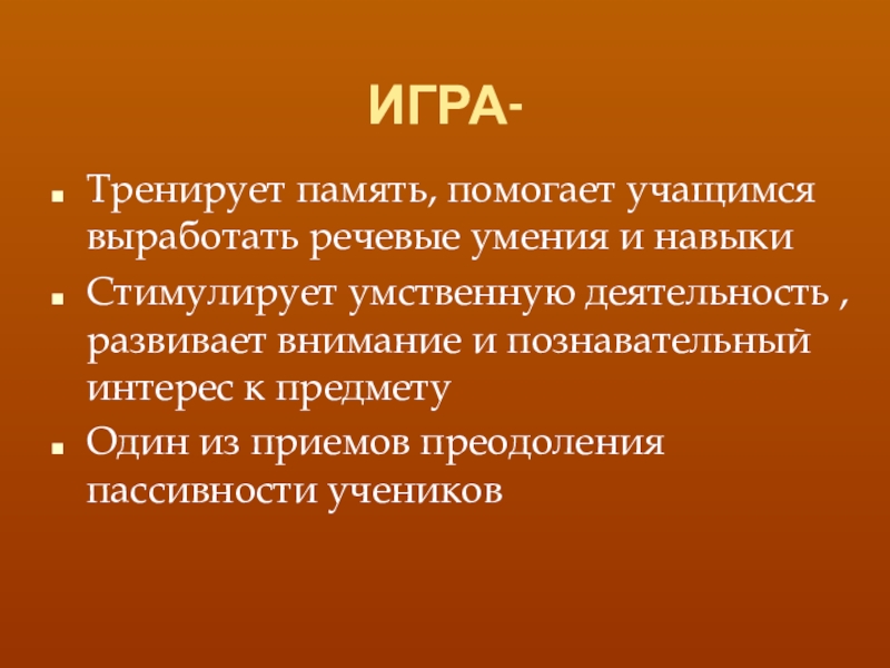 Тренирует память, помогает учащимся выработать речевые умения и навыки
