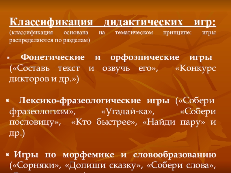 Слайд 28Классификация дидактических игр: (классификация основана на тематическом принципе: игры распределяются по