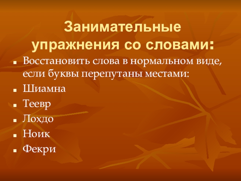 Восстановить слова в нормальном виде, если буквы перепутаны местами: