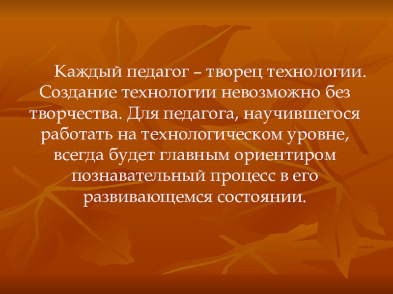 творчества. Для педагога, научившегося работать на технологическом уровне, всегда будет главным ориентиром познавательный процесс в его развивающемся состоянии.