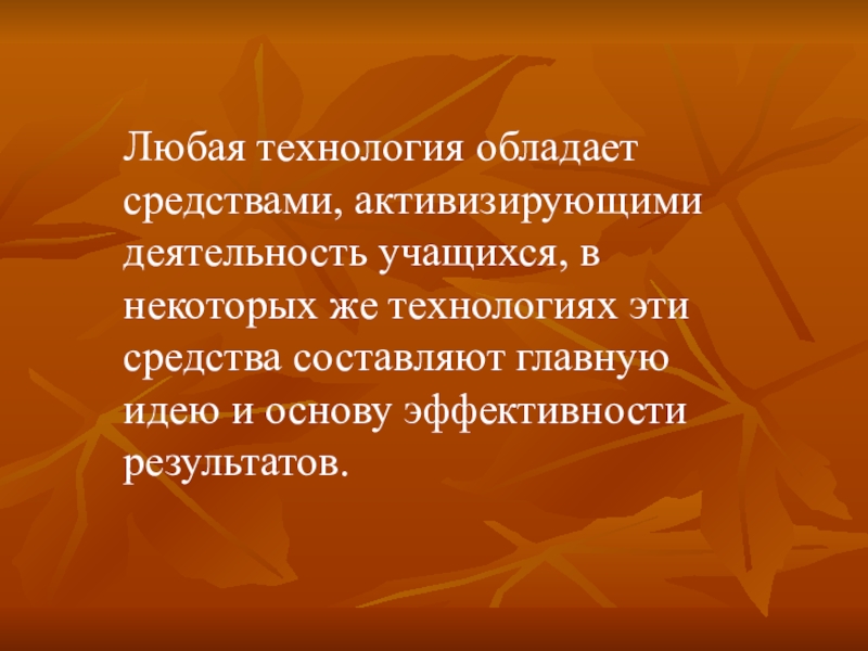 Слайд 12Любая технология обладает средствами, активизирующими деятельность учащихся, в некоторых же технологиях