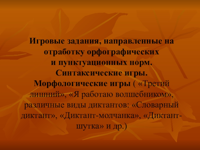 Слайд 29Игровые задания, направленные на отработку орфографических и пунктуационных норм. Синтаксические игры. Морфологические