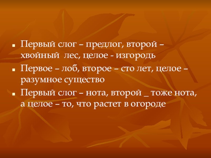 Слайд 34Первый слог – предлог, второй – хвойный лес, целое - изгородь