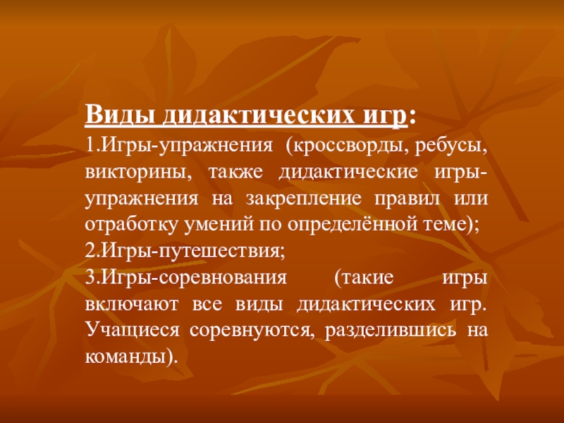 3.Игры-соревнования (такие игры включают все виды дидактических игр. Учащиеся соревнуются, разделившись на команды).