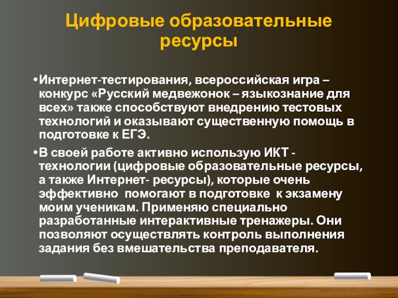 В своей работе активно использую ИКТ -технологии (цифровые образовательные ресурсы, а также Интернет- ресурсы), которые очень эффективно помогают в подготовке к экзамену моим ученикам. Применяю специально разработанные интерактивные тренажеры. Они позволяют осуществлять контроль выполнения задания без вмешательства преподавателя.