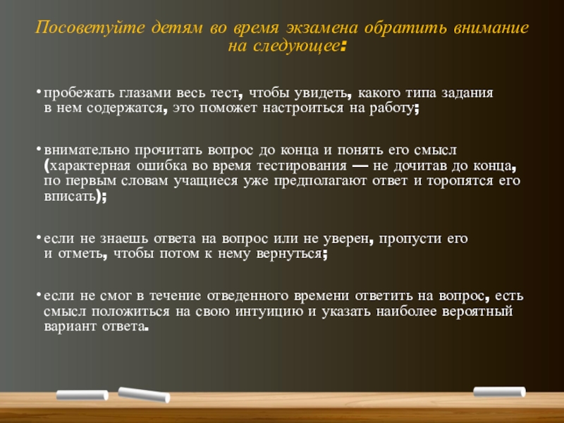 Слайд 5Посоветуйте детям во время экзамена обратить внимание на следующее: