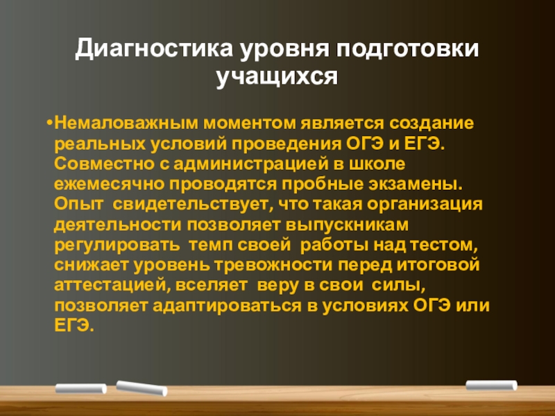 и ЕГЭ. Совместно с администрацией в школе ежемесячно проводятся пробные экзамены. Опыт свидетельствует, что такая организация деятельности позволяет выпускникам регулировать темп своей работы над тестом, снижает уровень тревожности перед итоговой аттестацией, вселяет веру в свои силы, позволяет адаптироваться в условиях ОГЭ или ЕГЭ.
