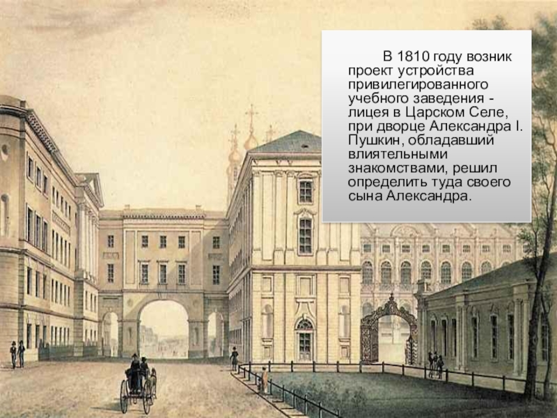 в Царском Селе, при дворце Александра I. Пушкин, обладавший влиятельными знакомствами, решил определить туда своего сына Александра.