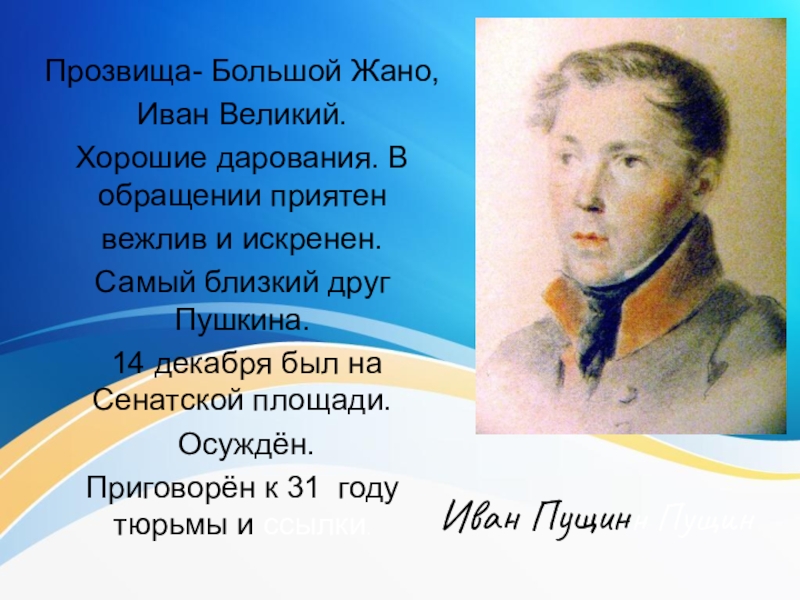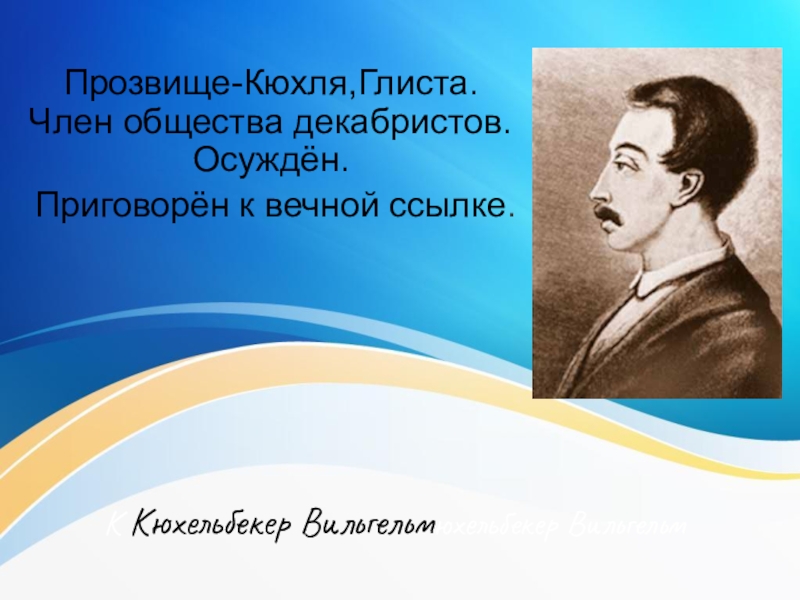 Прозвище-Кюхля,Глиста. Член общества декабристов. Осуждён.
