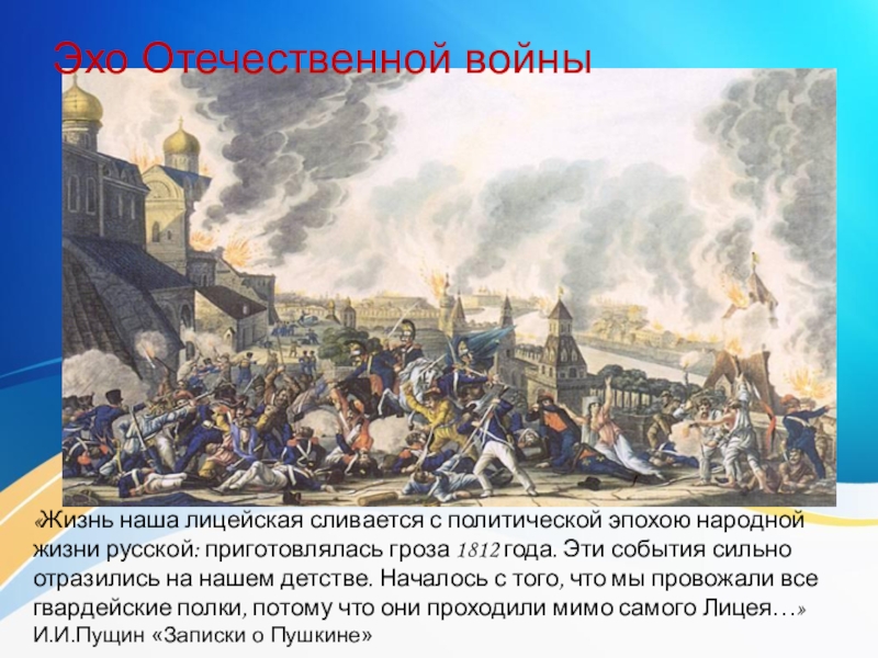 гроза 1812 года. Эти события сильно отразились на нашем детстве. Началось с того, что мы провожали все гвардейские полки, потому что они проходили мимо самого Лицея…» И.И.Пущин «Записки о Пушкине»