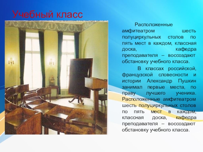В классах российской, французской словесности и истории Александр Пушкин занимал первые места, по праву лучшего ученика. Расположенные амфитеатром шесть полуциркульных столов по пять мест в каждом, классная доска, кафедра преподавателя – воссоздают обстановку учебного класса.