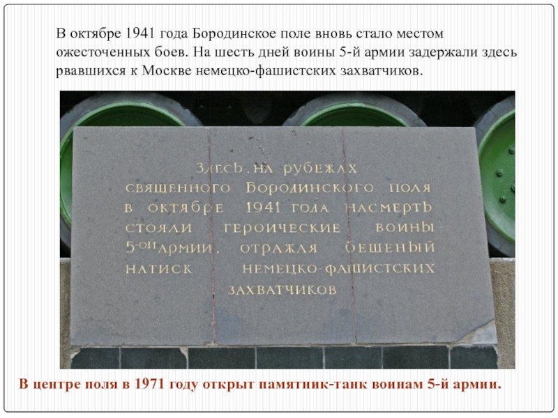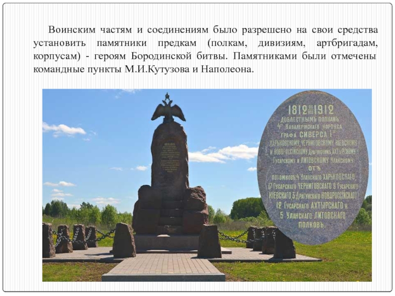предкам (полкам, дивизиям, артбригадам, корпусам) - героям Бородинской битвы. Памятниками были отмечены командные пункты М.И.Кутузова и Наполеона.