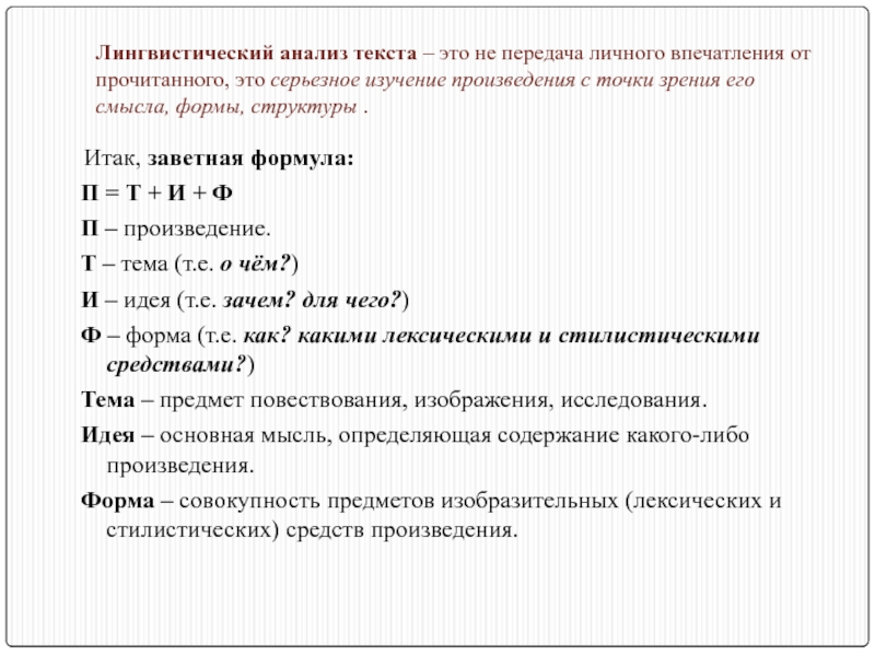 Слайд 22Лингвистический анализ текста – это не передача личного впечатления от прочитанного, это серьезное