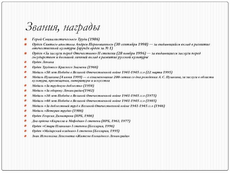 Слайд 6 У Лихачева было множество других наград, вот некоторые из них: