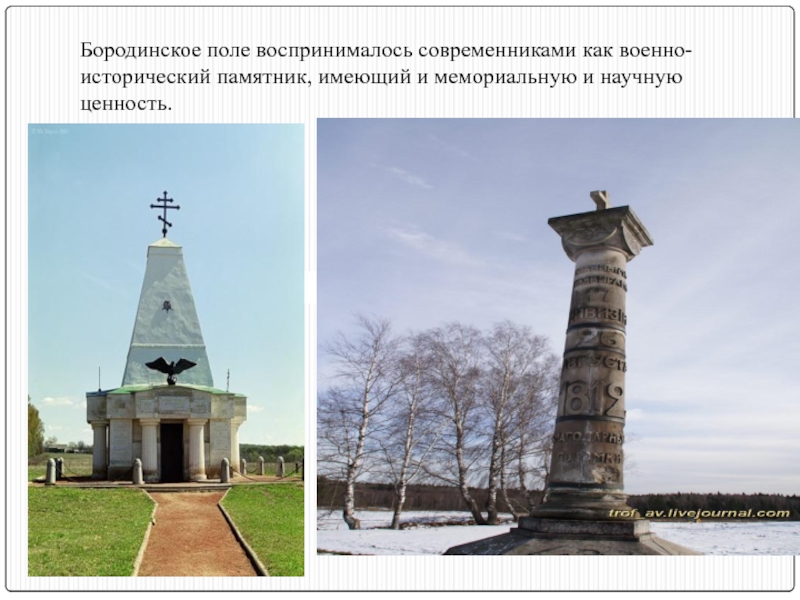 Слайд 11Бородинское поле воспринималось современниками как военно-исторический памятник, имеющий и мемориальную и