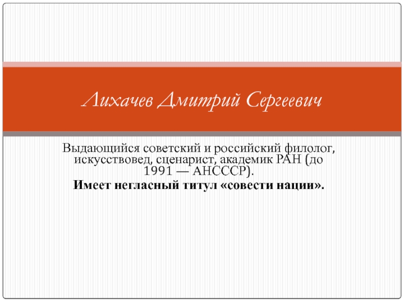 Слайд 1Выдающийся советский и российский филолог, искусствовед, сценарист, академик РАН (до 1991 — АНСССР).